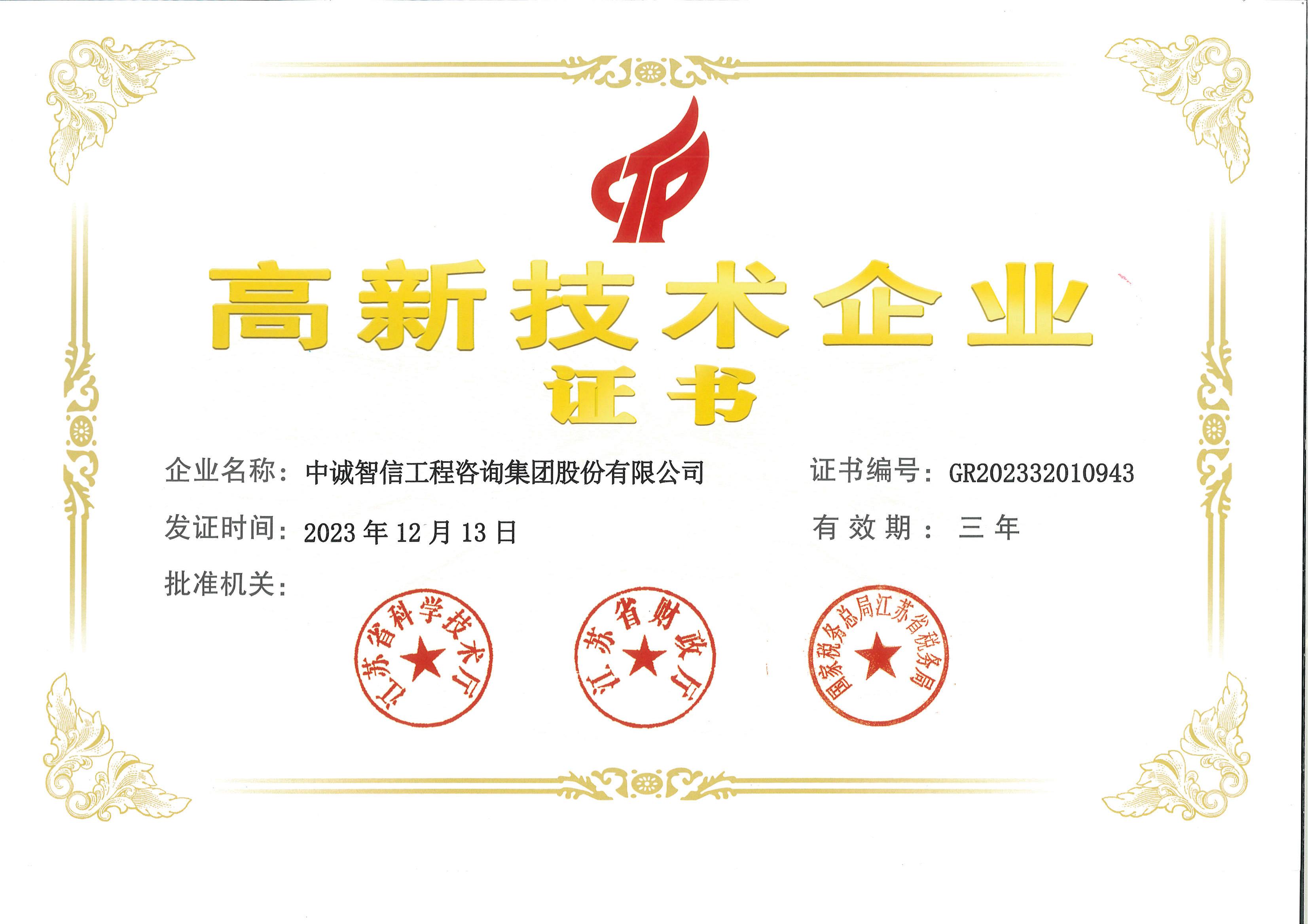高新技术企业证书