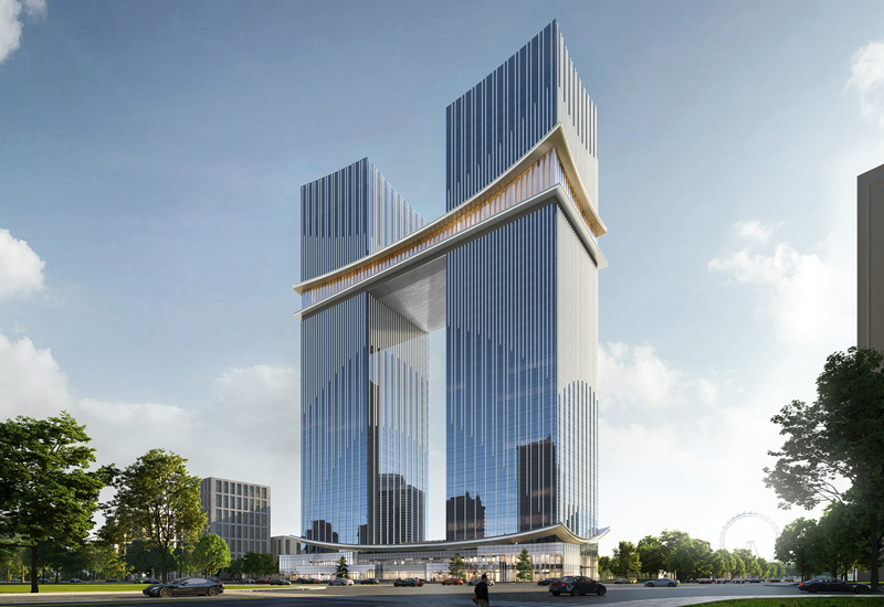 项目总建筑面积约22.4万平方米,地下建筑面积6.8万平方米,地上建筑面积约15.6万平方米,包含一南一北两座39层的双子塔楼,包括商业配套、会议中心、办公总部及城市会客厅等功能。
